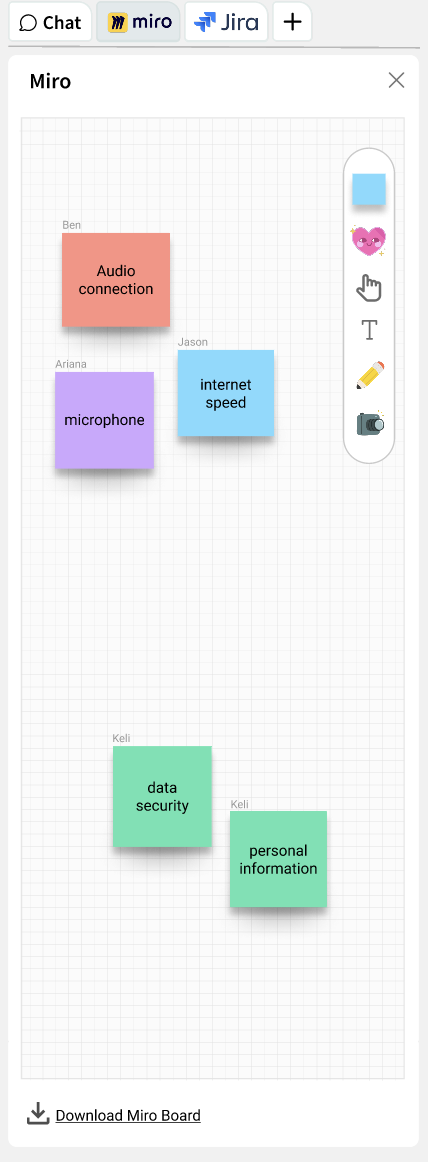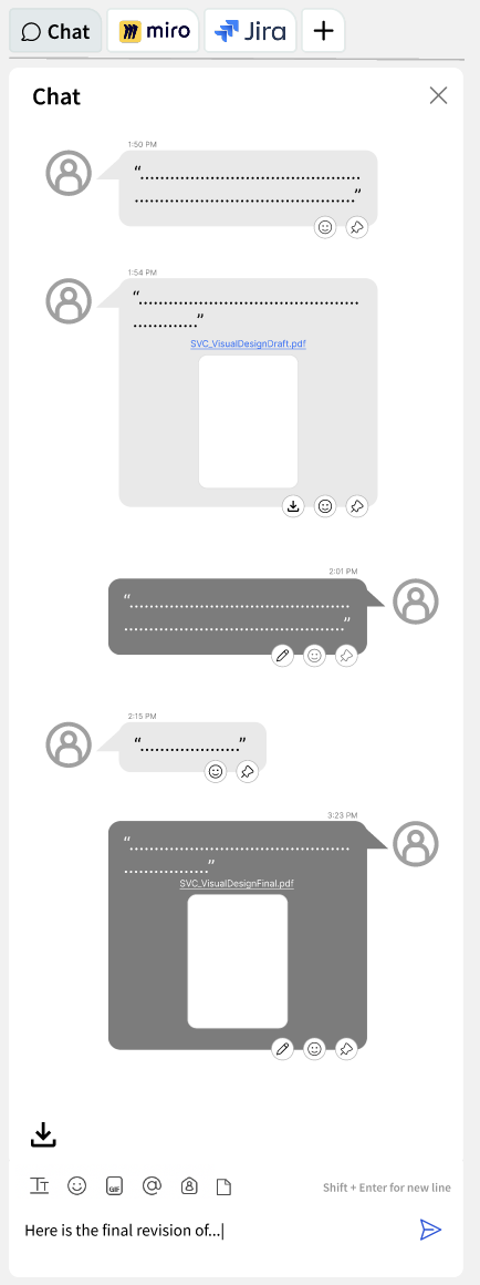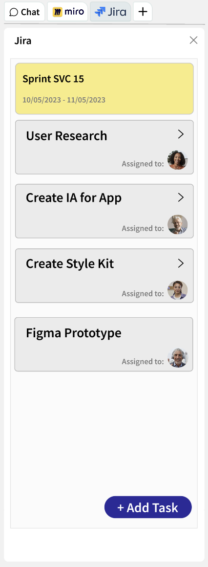 I saw an opportunity that the right-side chat pane could have tabs for additional productivity apps or tools. This concept below shows toggling tabs between chat, Miro, and Jira.
