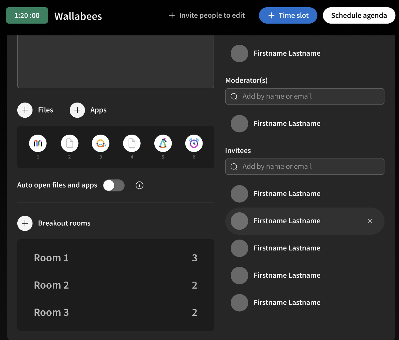 We had a concept built into our early prototype to set up breakout rooms in the agenda building phase. We also had a concept to set up asynchronous joining for attendees. We removed these features mid-stream to narrow our focus, but if we had more time, we would’ve loved to find a way to incorporate those.