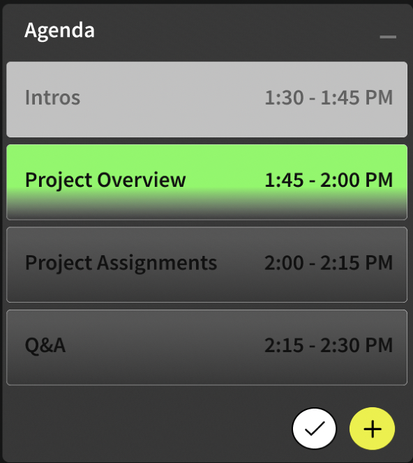 When the topic is two minutes away from its’ end time, the highlight color changes from green to red. The color change signals to begin wrapping discussion of that topic.