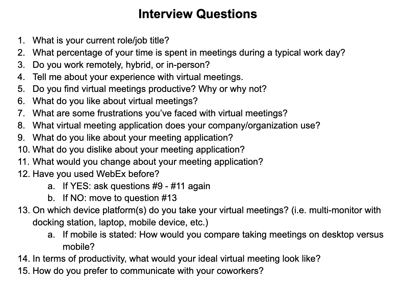 This information helped clarify the problem. Webex could increase their market share if their product made meetings shorter and more enjoyable. This insight helped my team refine the problem: How might we minimize both meeting frequency and duration so Webex can offer businesses a cost-effective solution?