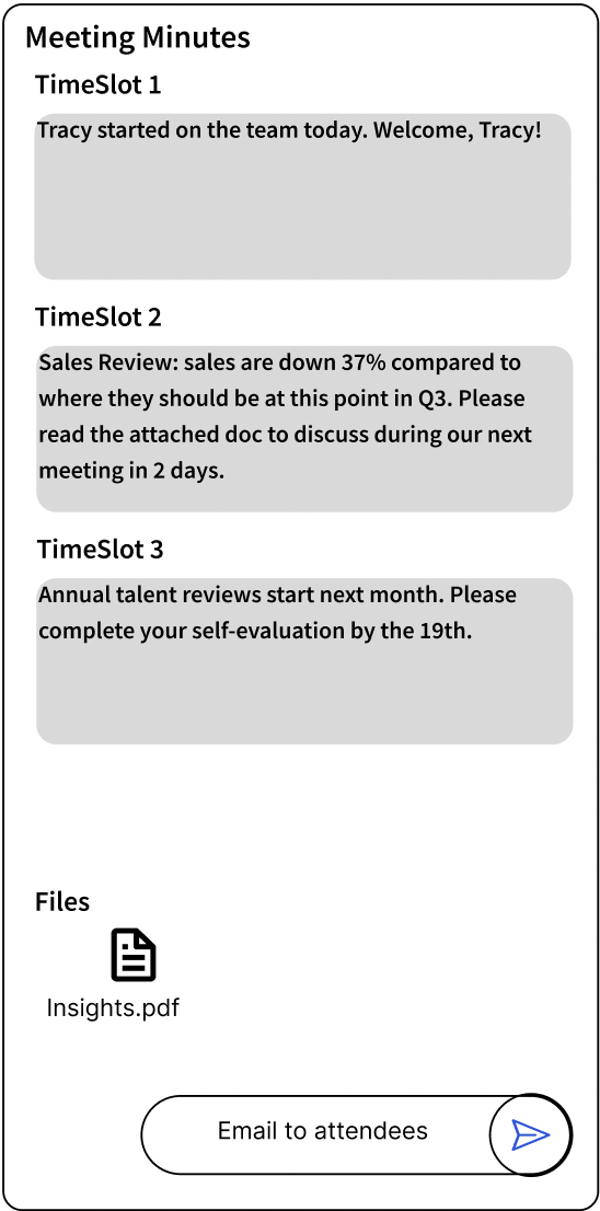 To ideate on the post-meeting experience, I created this lo-fi wireframe of a “Meeting Minutes“ concept- where a meeting summary (notes taken or files shared) could be emailed to attendees.